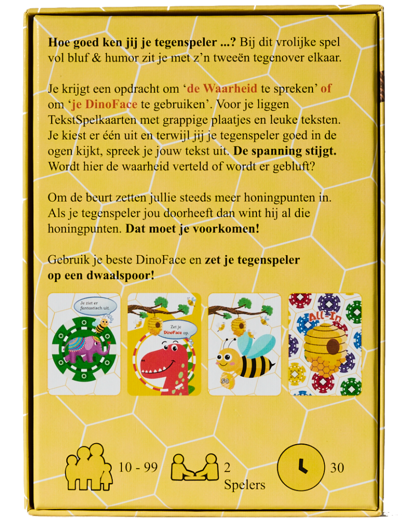 Houd je van een vrolijk spel vol Bluf en Humor? Maak je dan klaar voor Dino Face, het nieuwste spel dat nu verkrijgbaar is. Dit vrolijke spel, speciaal gemaakt voor 2 spelers, draait helemaal om het plezier en de speelse interactie tussen de deelnemers. Of je nu met je vrienden van school of met je gezin speelt, dit is het perfecte spel voor gezellige tijden samen!